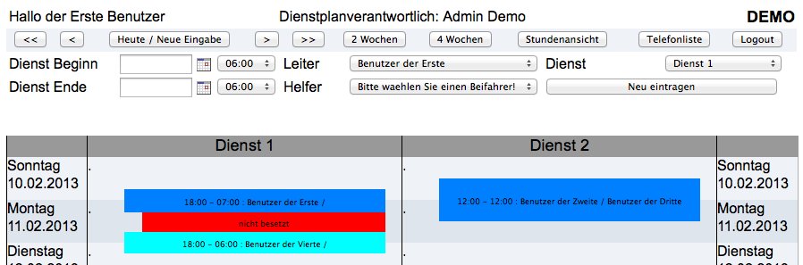 | Dann sind Sie hier richtig. Egal ob Dienstplan, Schichtplan oder Bereitschaftsplan. Egal ob Verein oder Firma. Verwalten Sie ihren Dienstplan online. Jeder ihrer Mitglieder kann sich online selbst eintragen und Sie als Verantwortlicher haben immer und überall einen aktuellen Überblick. |